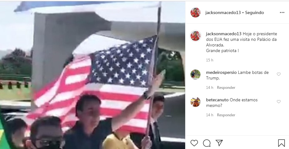“Hoje o presidente dos EUA fez uma visita no Palácio da Alvorada. Grande patriota!”, disse Jackson ao criticar o patriotismo do presidente. Veja o post: https://www.instagram.com/p/B_ve3u1J9gJGKgJ1ASgpcLrwYrKbemjp6bBftE0/?igshid=9h0v6n2xgpl4
