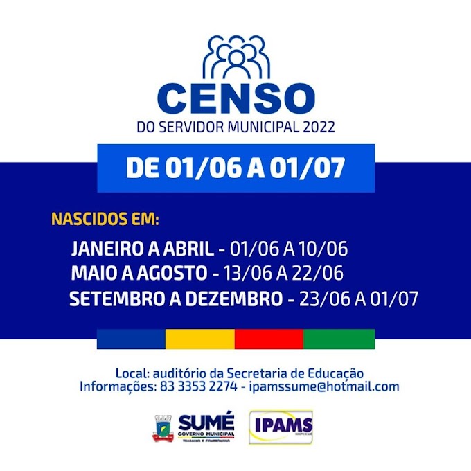INFORME PUBLICITÁRIO – A Prefeitura de Sumé, através do Instituto de Previdência do Município – IPAMS – realizará de 1º de junho a 1º de julho, o Censo Previdenciário dos Servidores Públicos titulares de cargos efetivos (ativo, aposentado e pensionista).