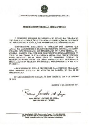 “O Conselho Regional de Medicina do Estado da Paraíba no uso das suas atribuições e visando a preservação da dignidade do atendimento a população e ao profissional médico resolve: desinterditar eticamente o trabalho dos médicos que atuam na maternidade e bloco cirúrgico do Hospital Materno Infantil João Marsicano”, diz trecho do documento ao qual o ClickPB teve acesso. Veja íntegra: