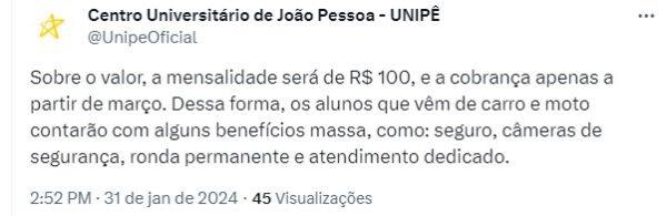 “Parabéns. A concorrência não precisa nem investir em marketing. Vocês mesmo mandam os alunos pra lá! Gestão top”, publicou outra estudante. “Eu faço questão de ir de Uber só pra não pagar estacionamento, e acredito que muitos farão o mesmo”, observou outro estudante.