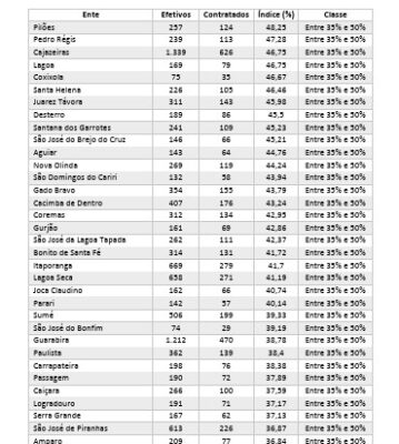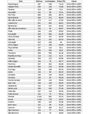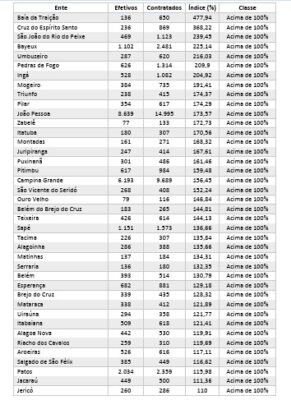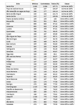 O relatório destaca casos graves, como Baía da Traição, com índice de 477,94% de contratados em relação a efetivos; Cruz do Espírito Santo (368,22%); e São João do Rio do Peixe (239,45%); Bayeux (225,14%); e Umbuzeiro (216,03%). Grandes municípios também figuram entre os irregulares, a exemplo de João Pessoa (173,57%); Campina Grande (156,45%); Patos (115,98%); e Santa Rita (107,71%).