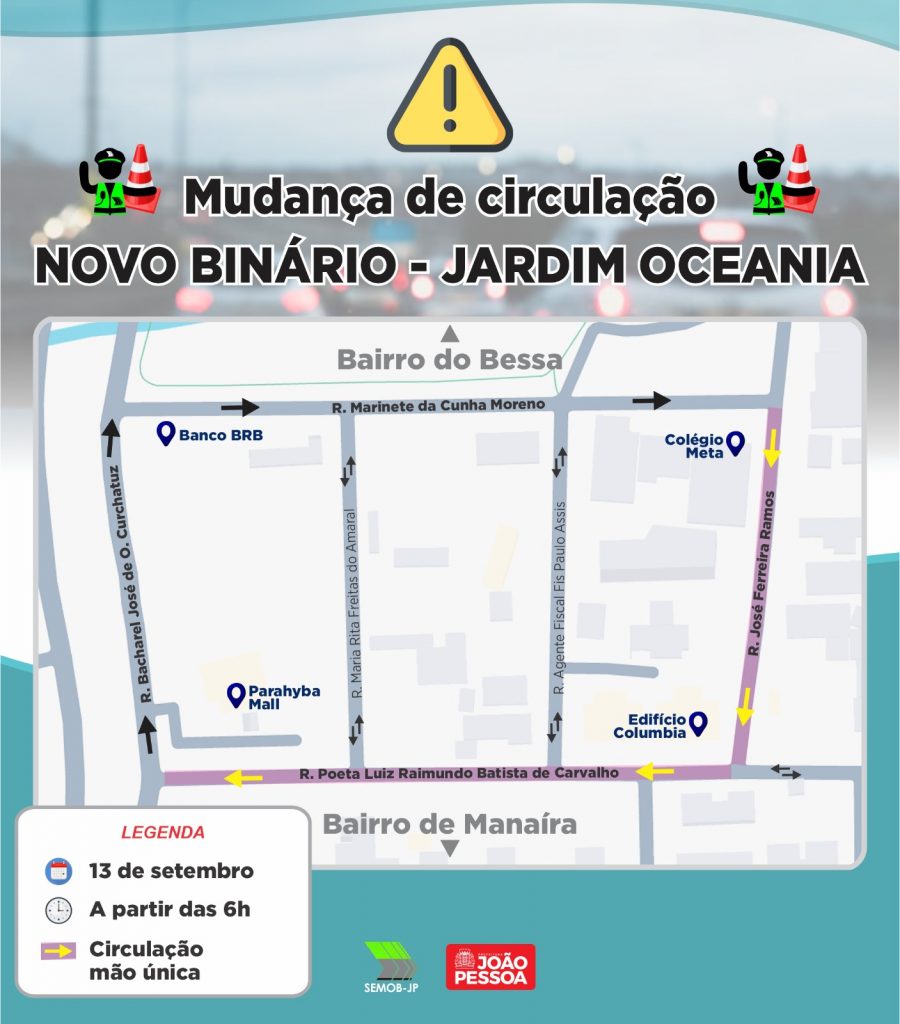 Duas ruas passarão a ter sentido único de circulação a partir deste sábado (13), no bairro Jardim Oceania, em João Pessoa. Segundo a Superintendência Executiva de Mobilidade Urbana da Capital (Semob-JP), a implantação do novo binário que tem como objetivo promover mais segurança viária e garantir maior fluidez ao tráfego da região.