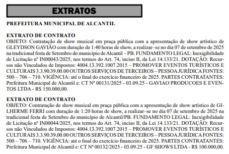 A Prefeitura Municipal de Alcantil, no Cariri da Paraíba, desembolsou R$ 250 mil na contratação dos shows de Gleydosn Gavião e Guilherme Ferri. O extrato de contrato foi publicado no Diário Oficial do Estado (DOE) desta sexta-feira (5).
