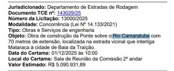 O Departamento de Estradas de Rodagem da Paraíba (DER-PB) lançou o edital de Licitação 13000/2025, na modalidade concorrência para a realização da obra de construção da Ponte sobre o Rio Camaratuba com 70 metros de extensão, localizada na estrada vicinal que interliga Mataraca à cidade de Baia da Traição.