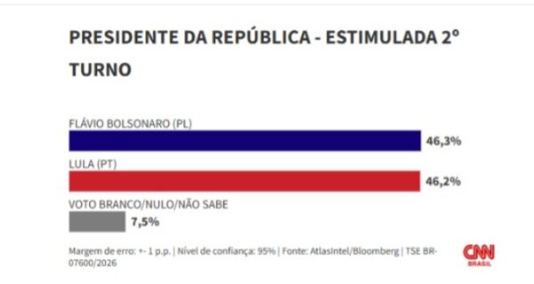 O senador Flávio Bolsonaro (PL) subiu nas intenções de voto e empatou com o presidente Luiz Inácio Lula da Silva (PT) no 2º turno, segundo pesquisa AtlasIntel/Bloomberg divulgada nesta quarta-feira (25).