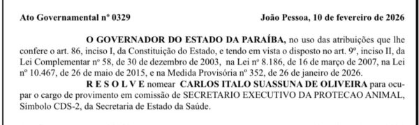 O governador João Azevedo nomeou o filho do vereador Guga Pet (PP), Ítalo Oliveira, como secretário-executivo de Proteção Animal.