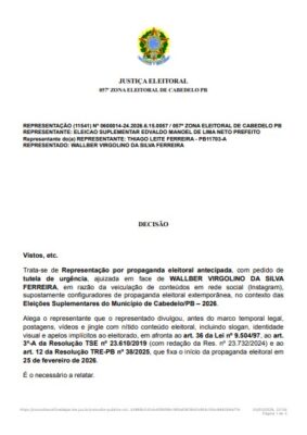 tutela de urgência, “em razão da veiculação de conteúdos em rede social (Instagram), supostamente configuradores de propaganda eleitoral extemporânea, no contexto das Eleições Suplementares do Município de Cabedelo/PB – 2026”.