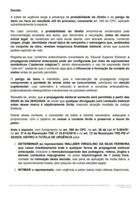 A juíza eleitoral da 57ª Zona Eleitoral, Thana Michelle Carneiro Rodrigues, determinou que Wallber Virgolino “cesse imediatamente toda e qualquer forma de propaganda eleitoral antecipada, inclusive a remoção/suspensão das postagens, vídeos, jingles e demais conteúdos impugnados, no prazo improrrogável de uma hora, contado da intimação desta decisão, sob pena de aplicação de multa diária”.