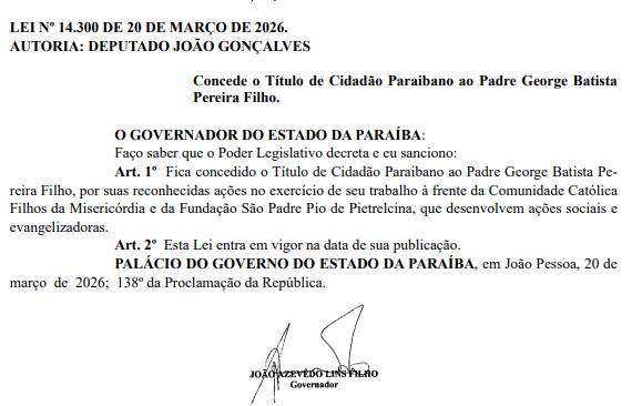 O governador João Azevêdo sancionou a concessão do Título de Cidadão Paraibano ao Padre George Batista Pereira Filho, diretor do Hospital Padre Zé. Como visto pelo ClickPB, a lei de autoria do deputado João Gonçalves foi publicada no Diário Oficial Estado deste sábado (21).