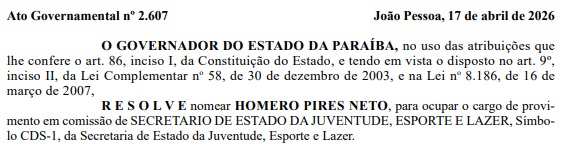 O governador Lucas Ribeiro nomeou Homero Pires Neto para assumir a chefia da Secretaria de Estado da Juventude, Esporte e Lazer da Paraíba (Sejel). A nomeação do secretário foi publicada no Diário Oficial do Estado deste sábado (18).