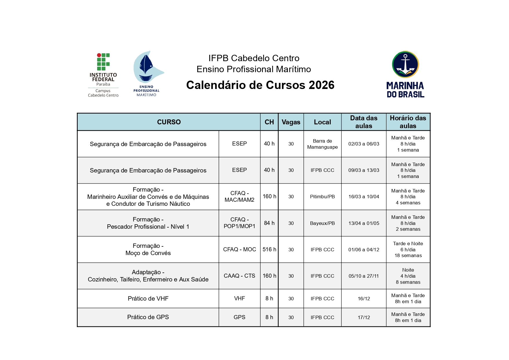De acordo com o calendário dos cursos obtido pelo ClickPB, as próximas turmas a serem abertas ofertarão 120 vagas para os cursos: Moço de Convés, Prático VHF e GPS, Cozinheiro, Taifeiro, Enfermeiro e Auxiliar de Saúde.