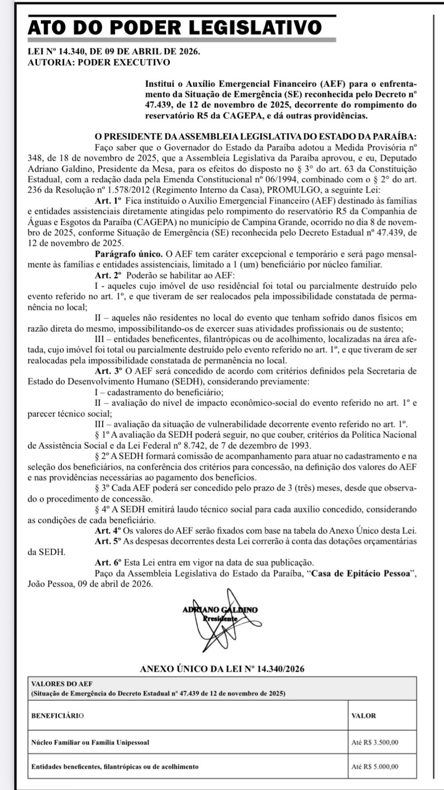 O Governo da Paraíba instituiu o Auxílio Emergencial Financeiro (AEF) destinado às famílias e entidades atingidas pelo rompimento do reservatório R5 da Cagepa, ocorrido em novembro de 2025, no município de Campina Grande.
